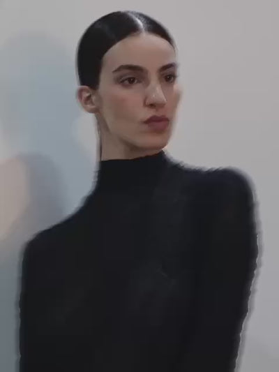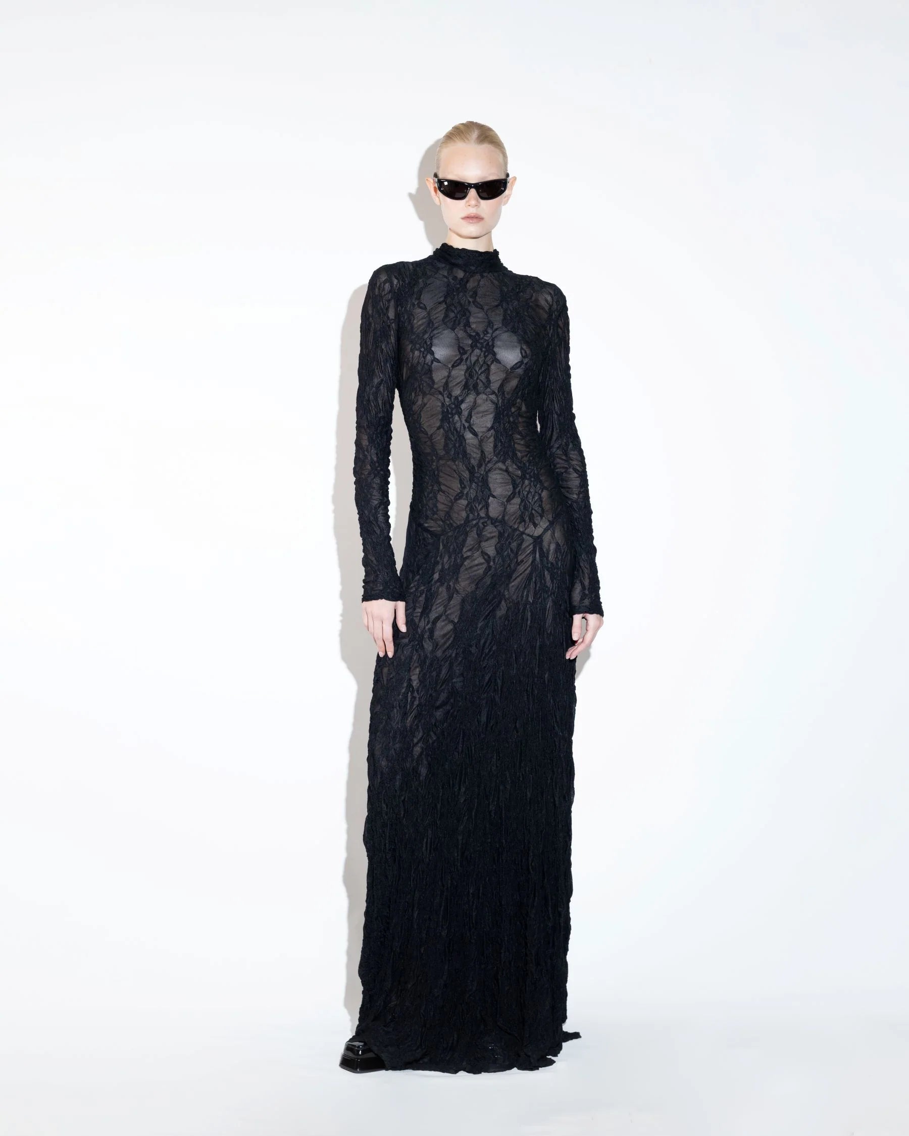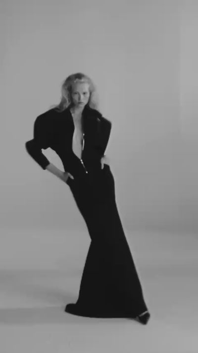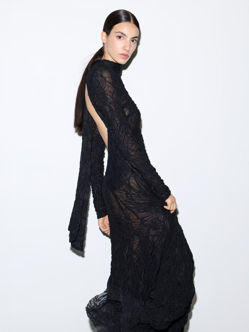 Delicate lace sculpted into a commanding, elongated form. With its open back and precise detailing, the dress captures a quiet sensuality rooted in timeless sophistication.